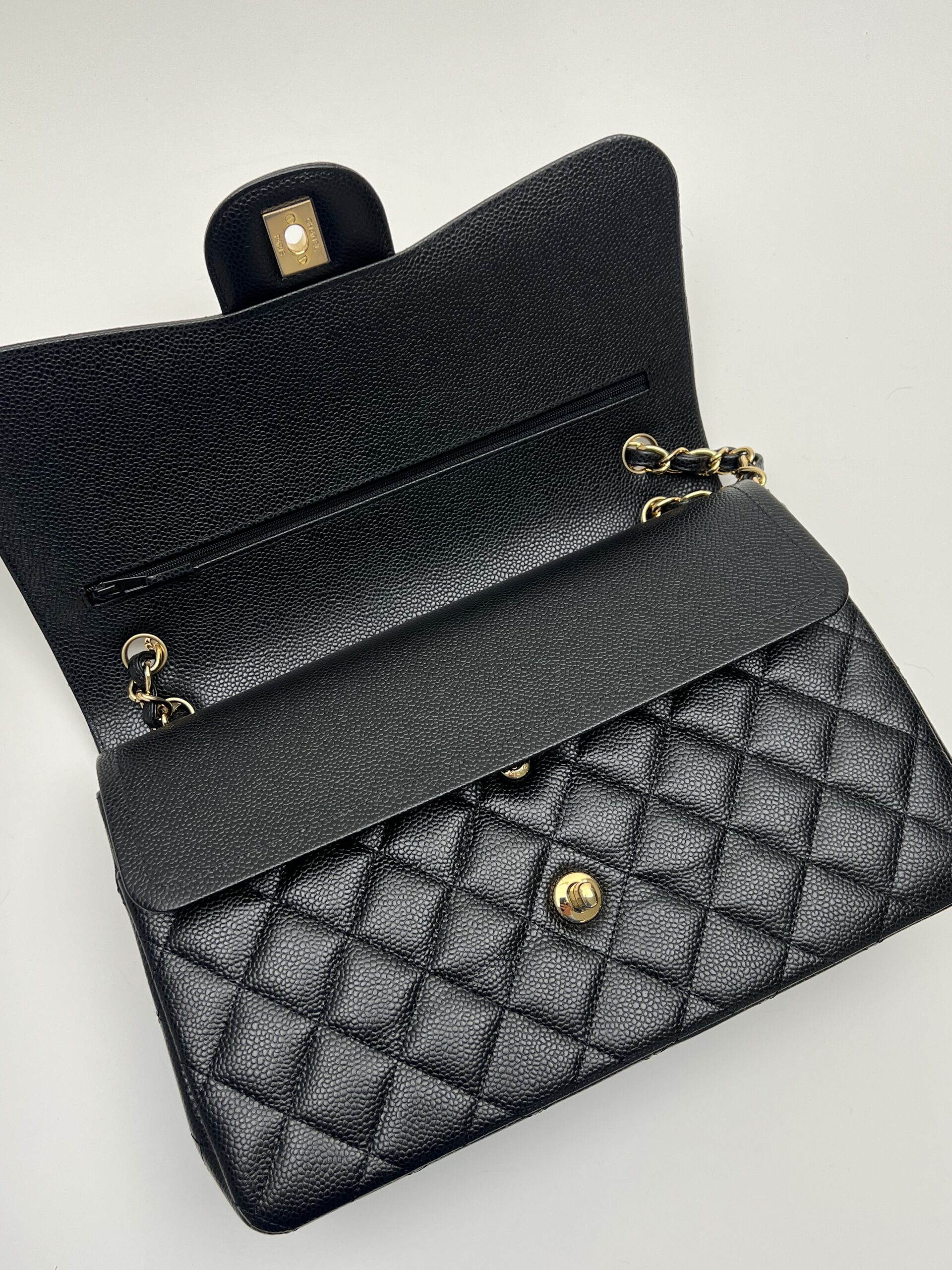 Questa Chanel Timeless Jumbo ย rappresenta un investimento eccezionale nel mondo della moda luxury. La pelle Caviar nera รจ rinomata per la sua resistenza e bellezza duratura, mentre l’hardware dorato aggiunge un tocco di raffinatezza senza tempo. La misura Jumbo รจ perfetta per l’uso quotidiano, offrendo spazio sufficiente senza compromettere l’eleganza. Il fatto che sia in condizioni pari al nuovo, con tutte le pellicole protettive ancora presenti, la rende un pezzo da collezione di valore inestimabile.