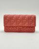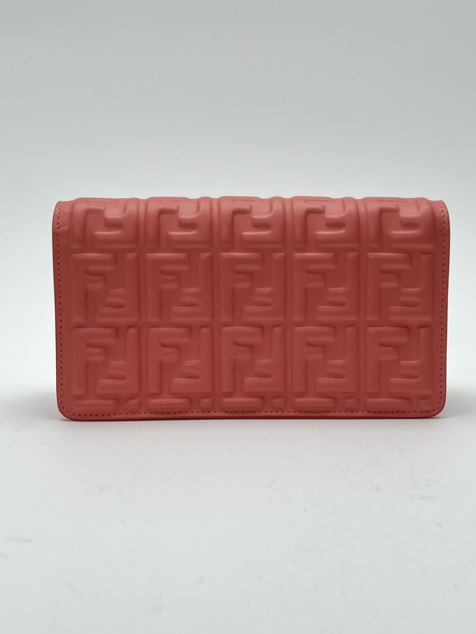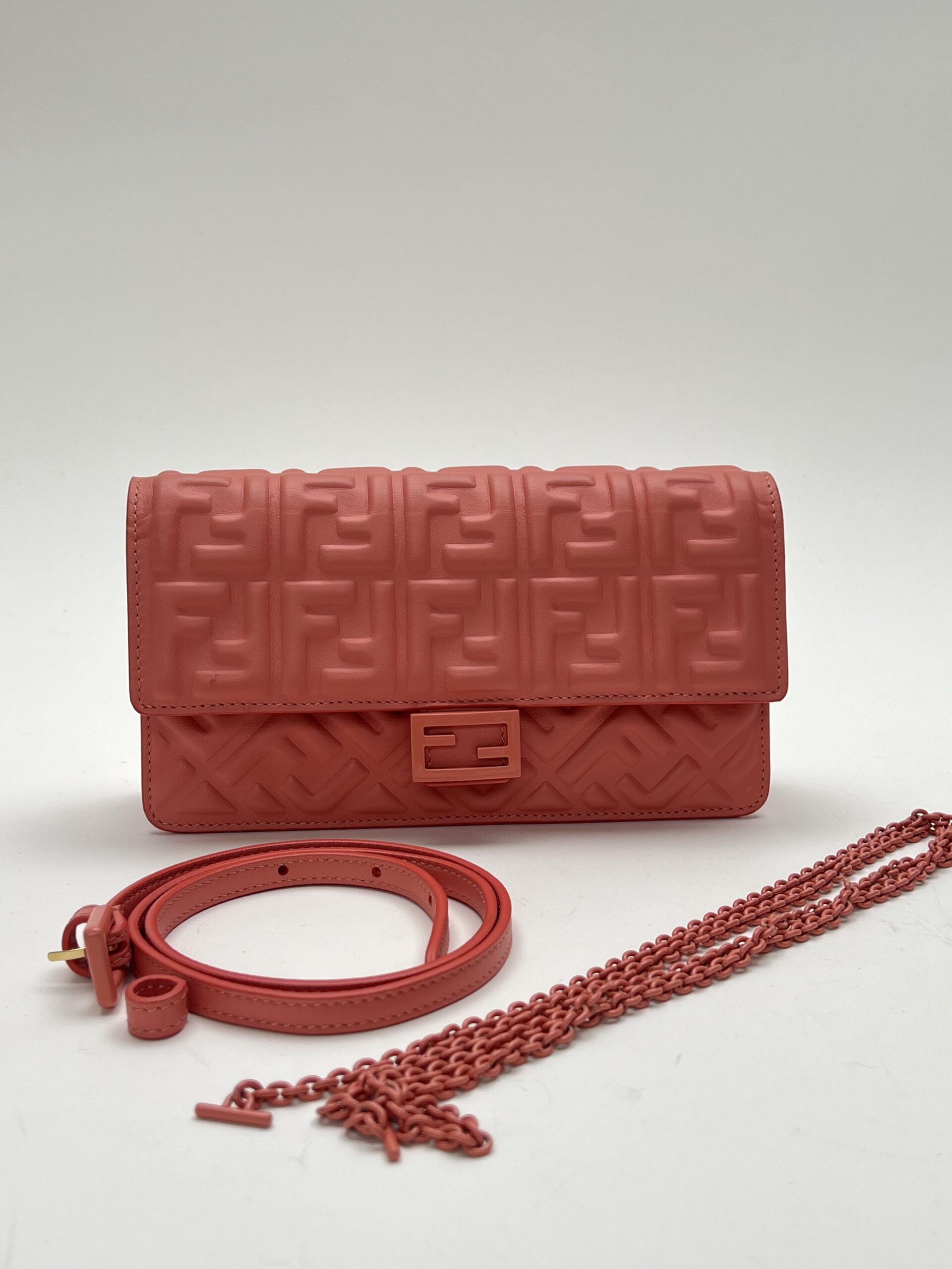 Elegante Fendi Baguette WOC in pelle FF rosa salmone con metalleria tono su tono. Versatile borsa 3-in-1: spalla, tracolla o clutch. Include manico amovibile, catena metallica e 6 scomparti per tessere. Condizioni ottime, completa di dustbag originale.